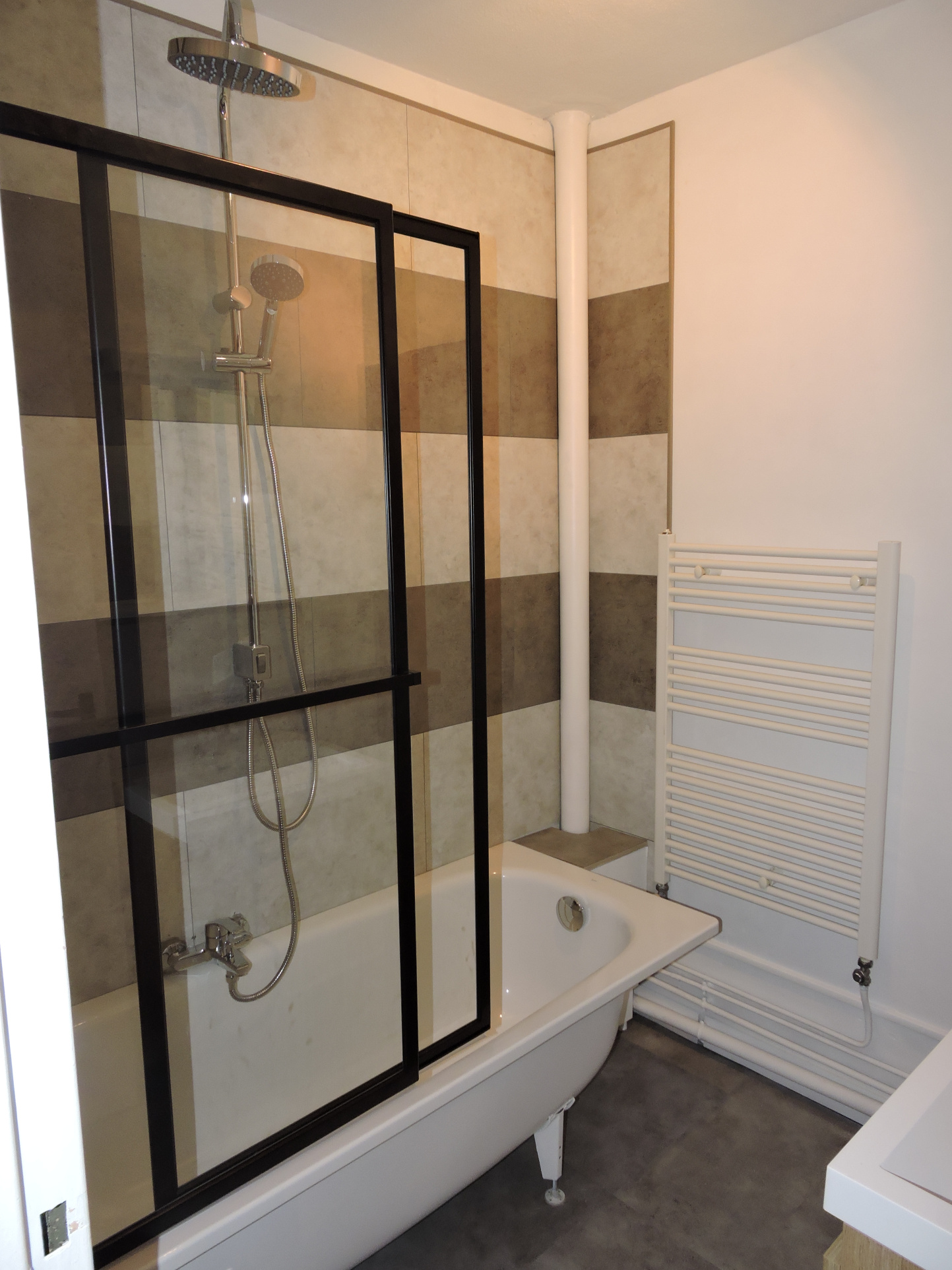 Appartement disposant d'une petite entrée, donnant sur une grande pièce principale avec cuisine ouverte, salle de bain et WC.